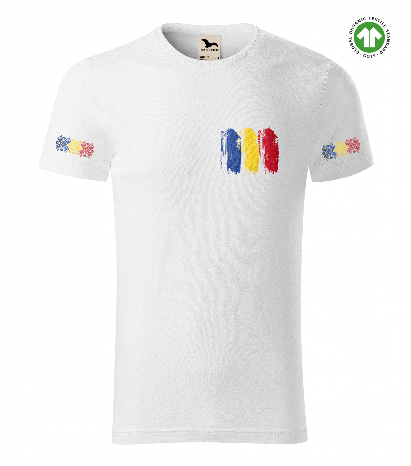 Tricoul personalizat marca Malfini este confecționat din bumbac organic certificat GOTS, asigurând confort și sustenabilitate. Designul său distinctiv include drapelul României pe piept și motive tradiționale pe mânecă în culorile tricolorului, reflectând cu mândrie cultura și identitatea națională.